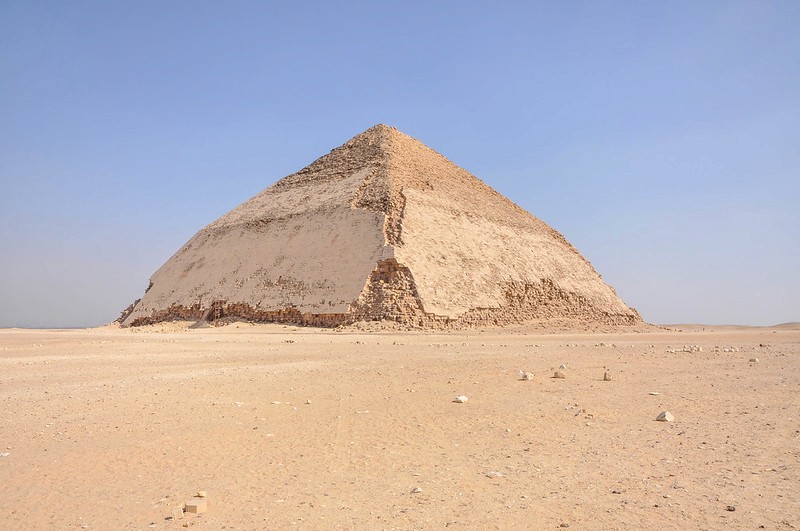 The Bent Pyramid represents a change from the step-sided pyramids of before to smooth-sided pyramids. It has been suggested that due to the steepness of the original angle of inclination the structure may have begun to show signs of instability during construction - Source