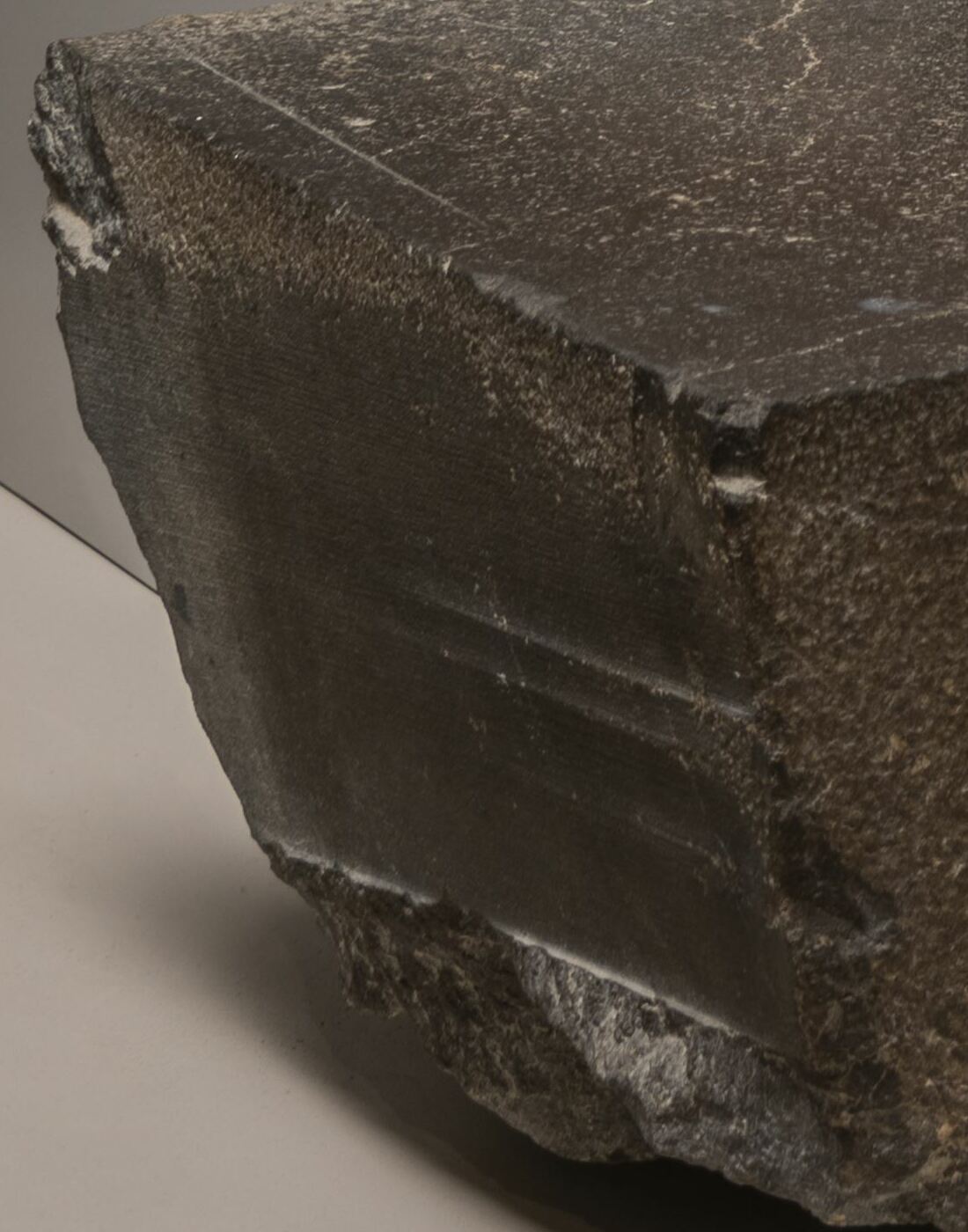 A floor slab from the pyramid temple of Khufu bearing visible saw marks on granite, revealing the advanced stone-cutting techniques and material precision behind Old Kingdom monumentality. Source