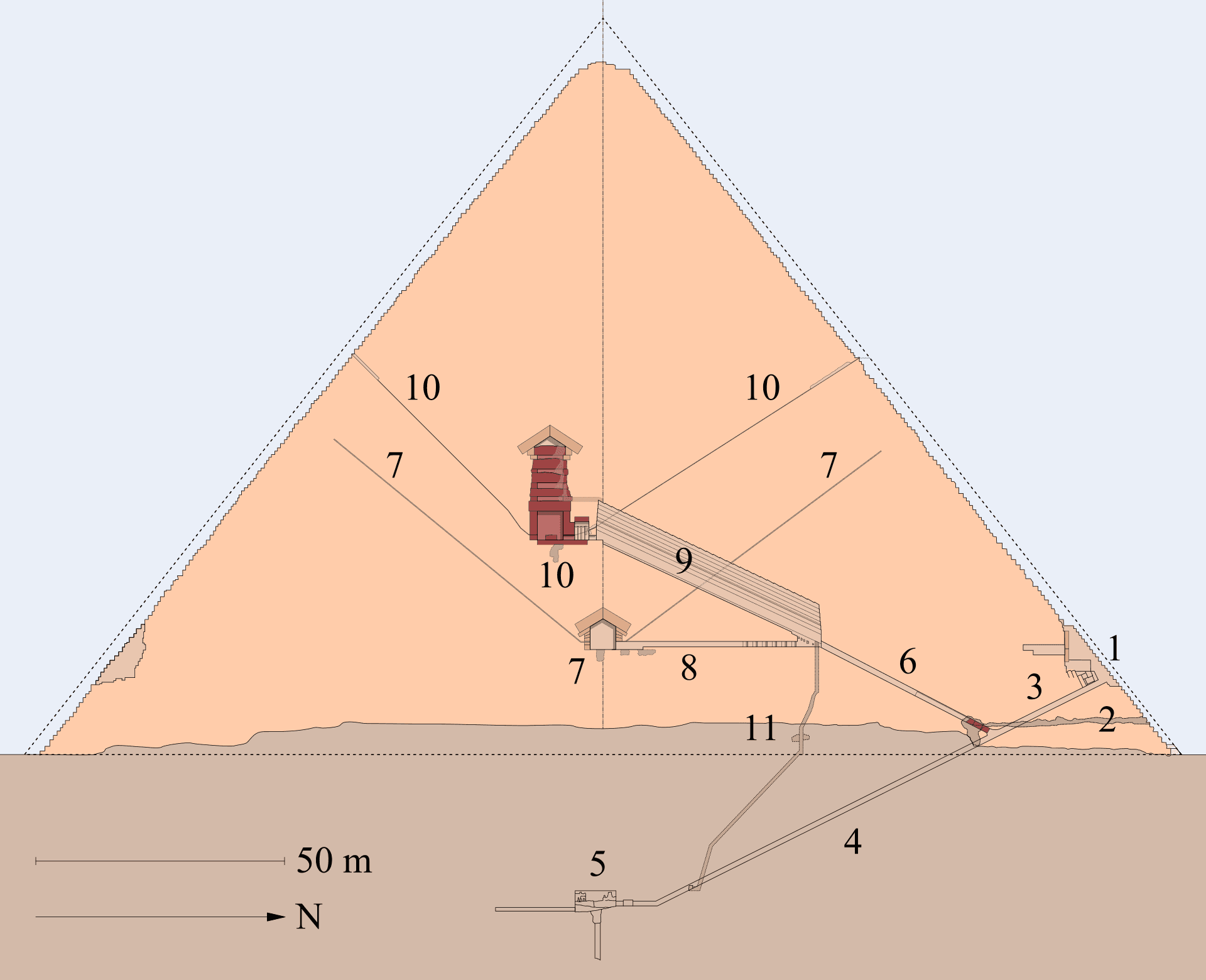 Modern scanning and survey techniques reveal a complete sectional understanding of the Great Pyramid of Giza, exposing its internal passages and voids as a rigorously controlled spatial system rather than a solid mass of stone. - Source
